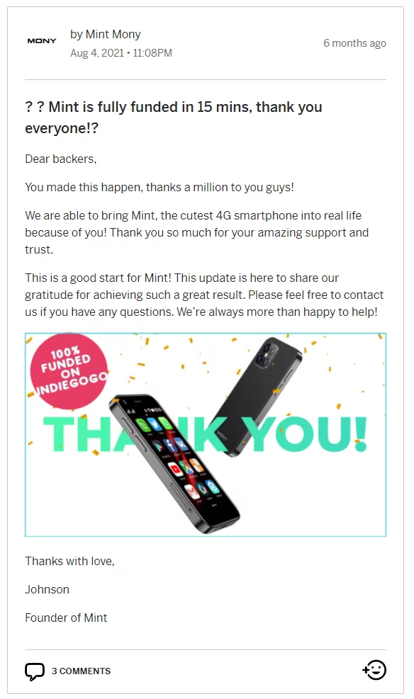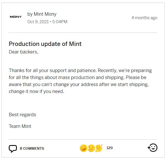 「募集開始後 15分で 目標金額達成しました!」と「これから出荷準備するので、住所確認よろしくね」的な更新しかなかった。